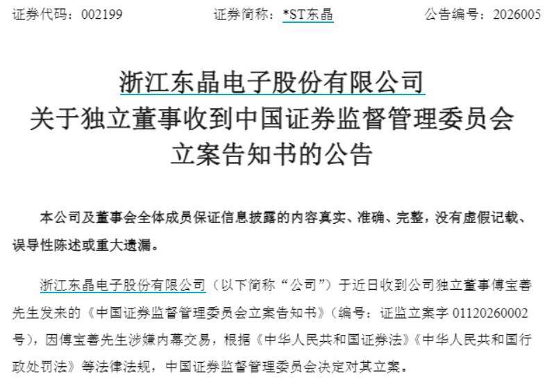 【大河财立方音讯】1月13日,浙江东晶电子股份有限公司(证券简称:*ST东晶)发布公告称,近日收到公司零丁董事傅宝善发来的《中国证券监督处分委员会立案陈诉书》,因其涉嫌内幕往来,中国证监会决定对其立案。