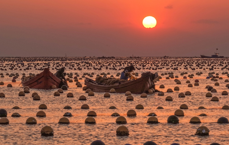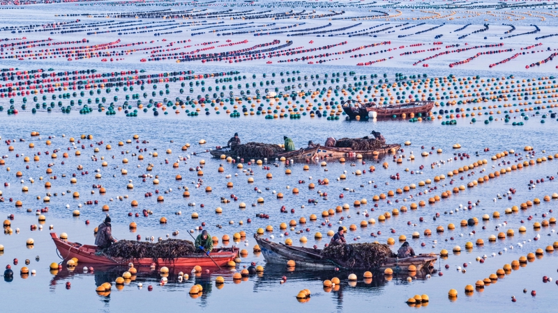 山东省荣成市小海带迎来收货季,衍生工东说念主吃力收货,投放春节市集。